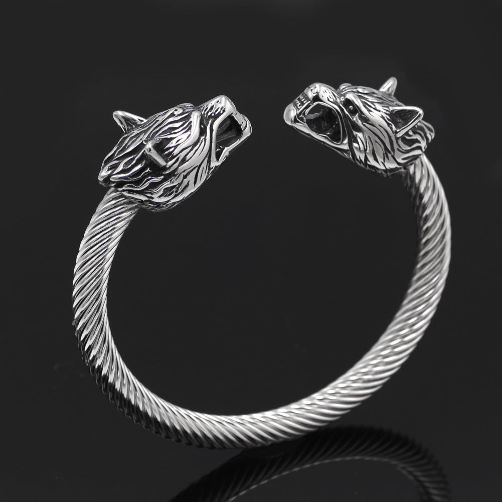 دلل نفسك بسوار من تصميم رأس الذئب المزدوج المستوحى من الفايكنج. مصنوع من الفولاذ المقاوم للصدأ، هذا السوار ذو الأكمام سيدوم لسنوات قادمة. المعدن خفيف الوزن ومريح في الارتداء، ومثالي للتكديس مع الأساور الأخرى.