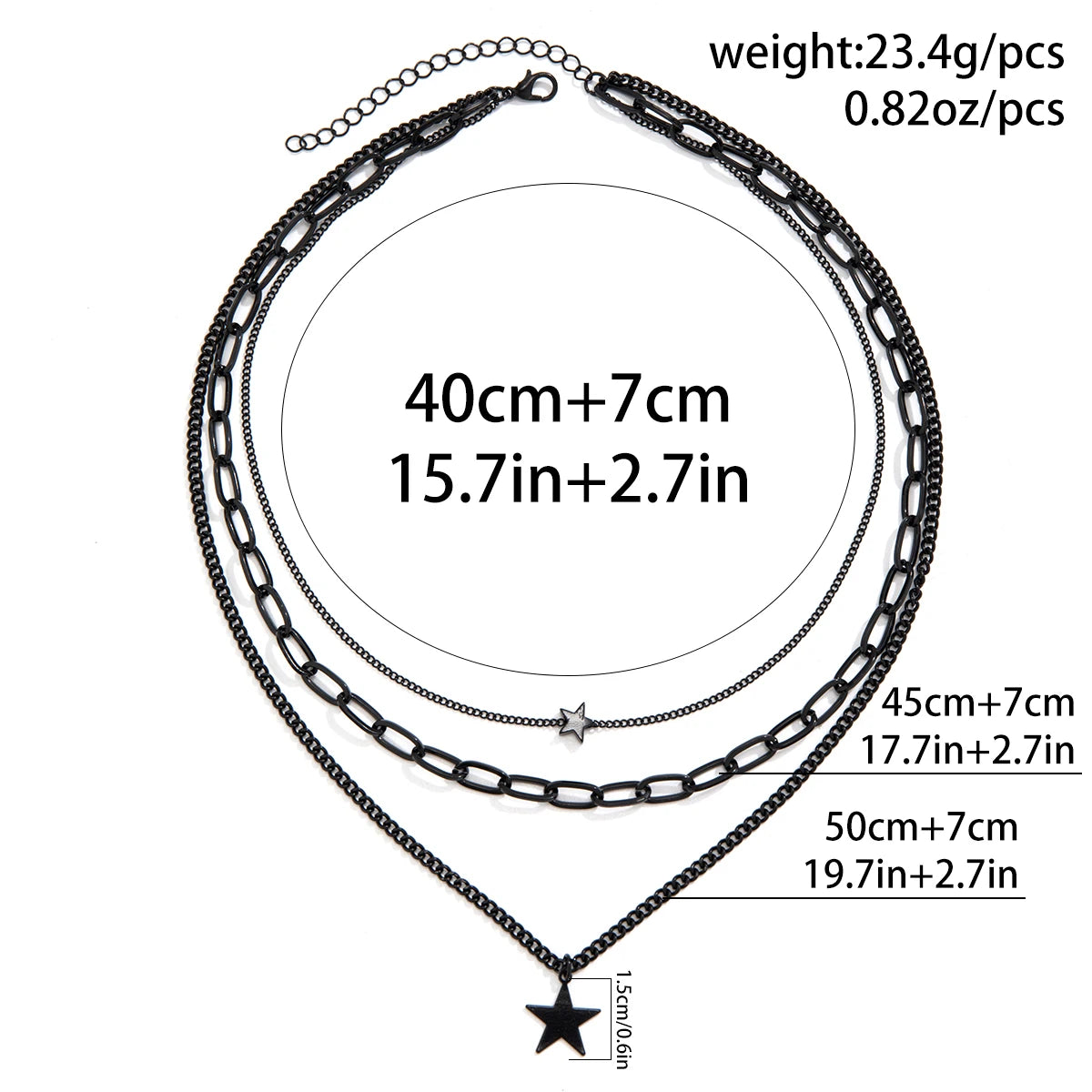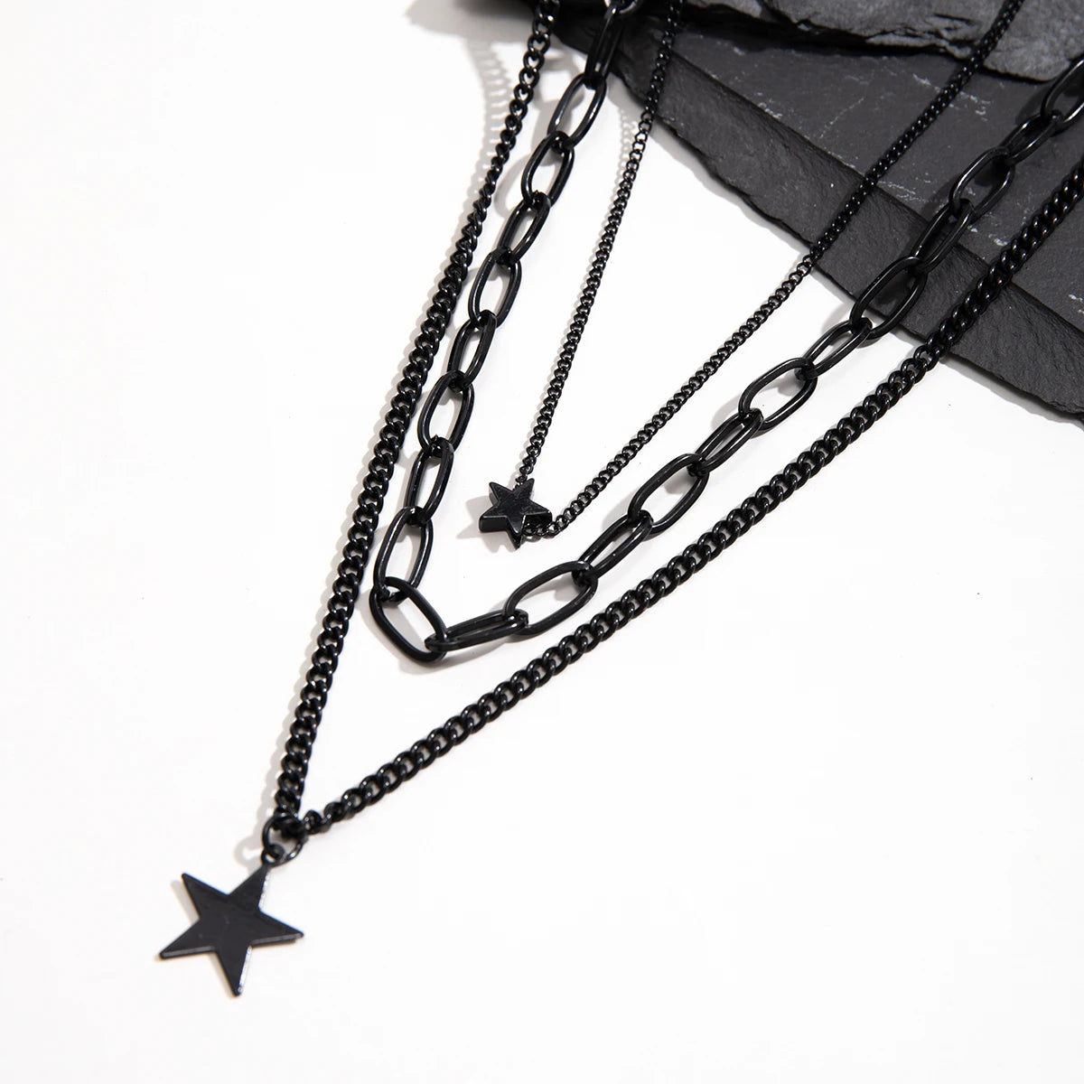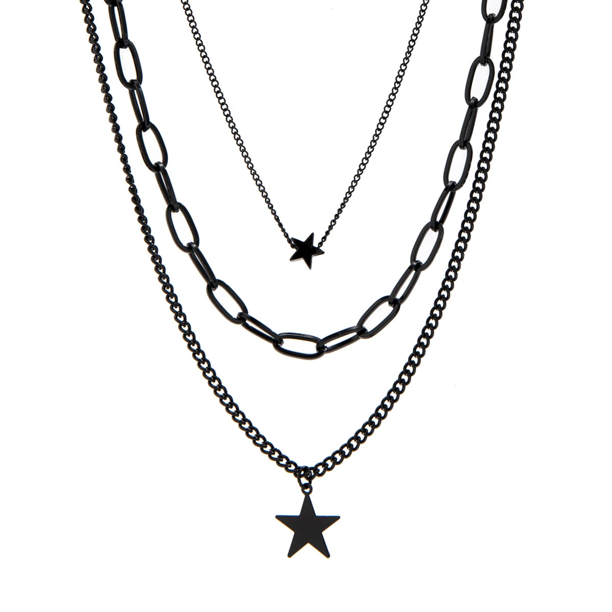 Unleash your edge with this striking Black Layered Chains Small Stars Necklace. Crafted from durable zinc alloy with a bold link chain design, this piece stacks attitude and celestial charm in one fearless statement. The delicate star accents add an unexpected twist to the dark, moody aesthetic—perfect for those who refuse to play it safe. Layer it, wear it solo, or mix it with your boldest pieces. This is jewelry for the unapologetically daring.