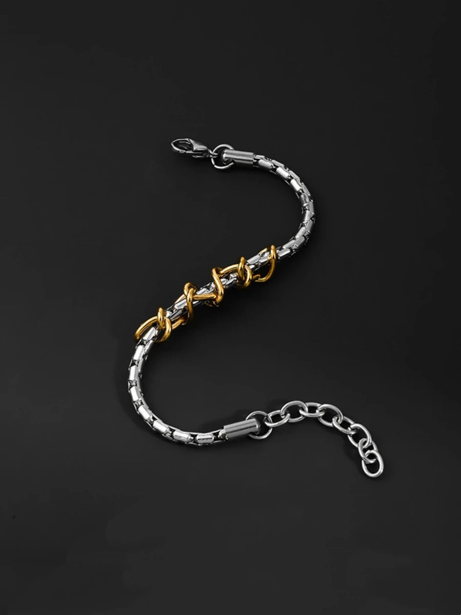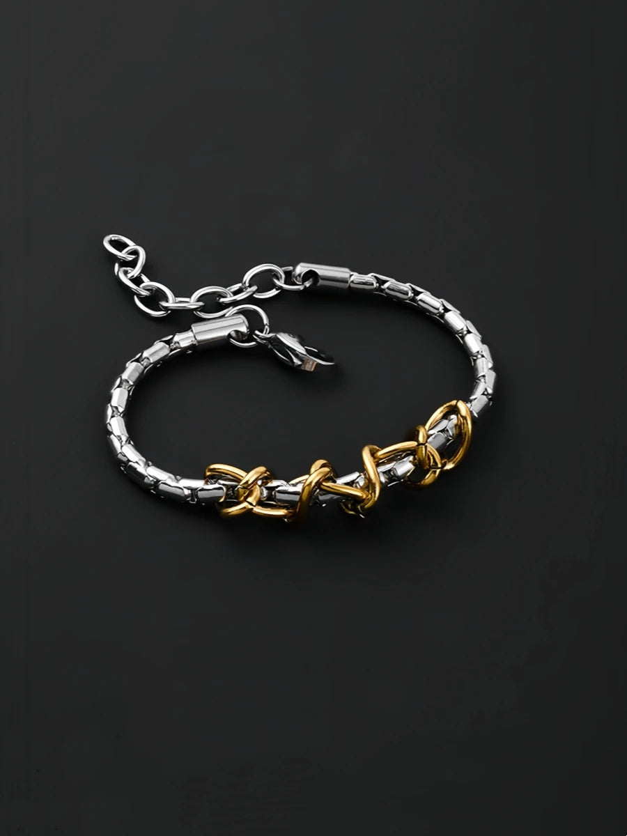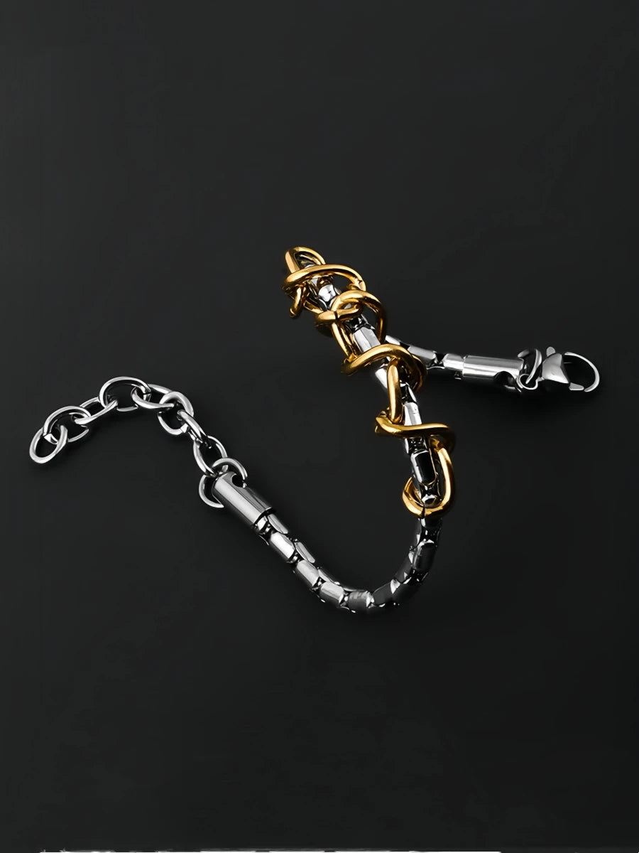Make a bold statement with this striking dual-tone chain bracelet. Featuring a robust link chain design in stainless steel with contrasting gold and silver finishes, this piece merges edgy sophistication with fearless style. The interplay of precious-looking tones creates visual depth while the durable stainless steel construction ensures it withstands your most adventurous moments.