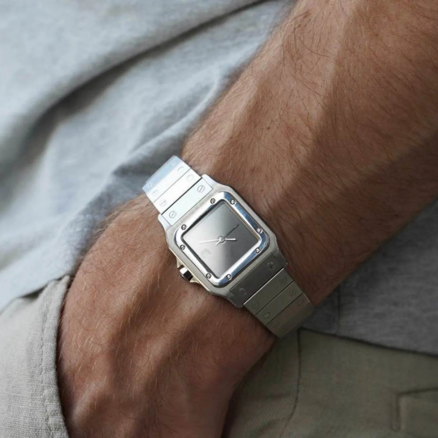 Stripped of unnecessary numerals, this silver square watch embraces bold minimalism. The clean dial demands attention through sheer geometric confidence—no numbers to distract from its striking presence. Precision quartz movement keeps time with unwavering reliability, while the polished silver case catches light with understated edge.