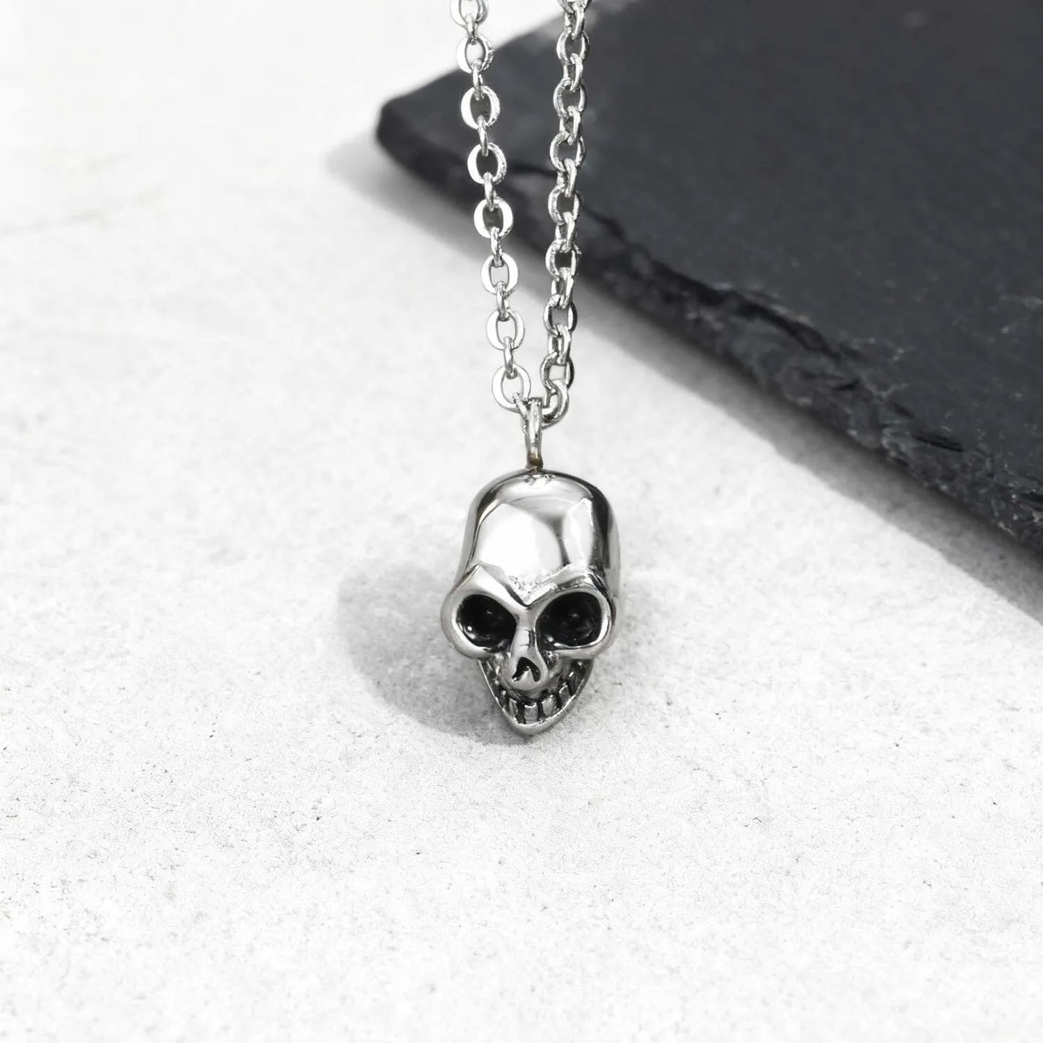 Mini Steel Skull Pendant Necklace Embrace the rebel within. This compact skull pendant necklace channels dark sophistication and unapologetic attitude. Suspended from a sleek steel chain, the miniature skull design packs maximum impact in a refined package—proof that fearless style doesn't require excess.