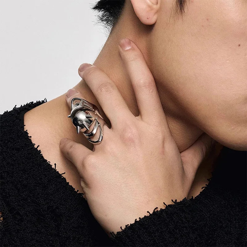 The Armor Eye Cyberpunk Ring Unleash your inner rebel with this audacious ring that screams futuristic defiance. Dominated by an arresting eye symbol wrapped in angular, armor-like details, this piece is engineered for those who refuse to blend in. It's a wearable declaration of independence—perfect for cyberpunk enthusiasts, digital nomads, and anyone ready to weaponize their style.