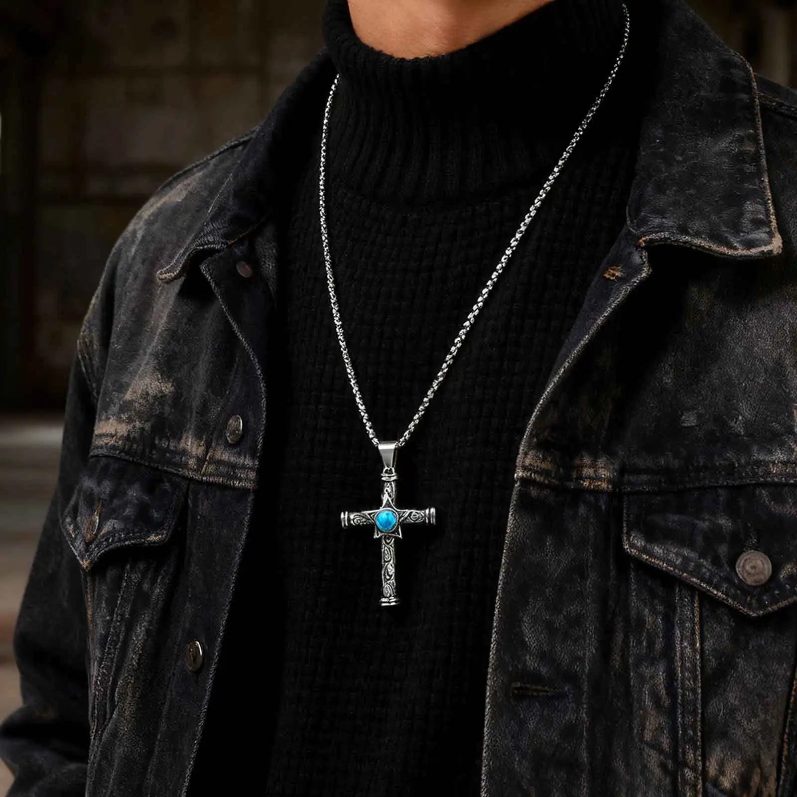 Make a fearless statement with this striking blue stone cross pendant necklace. The vibrant blue stone commands attention while the cross design channels spiritual strength and bold conviction. Suspended from a durable stainless steel chain that resists tarnish and corrosion, this piece is built for those who wear their beliefs unapologetically. Whether layered with other pieces or worn as a standalone declaration, this necklace refuses to whisper—it roars. Timeless defiance meets modern edge.