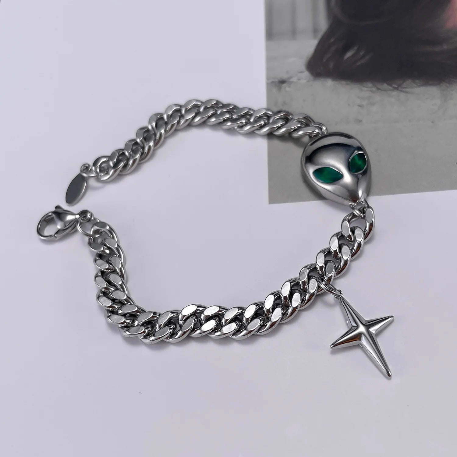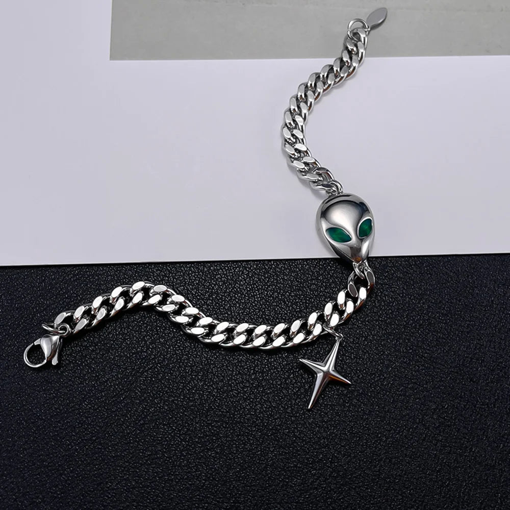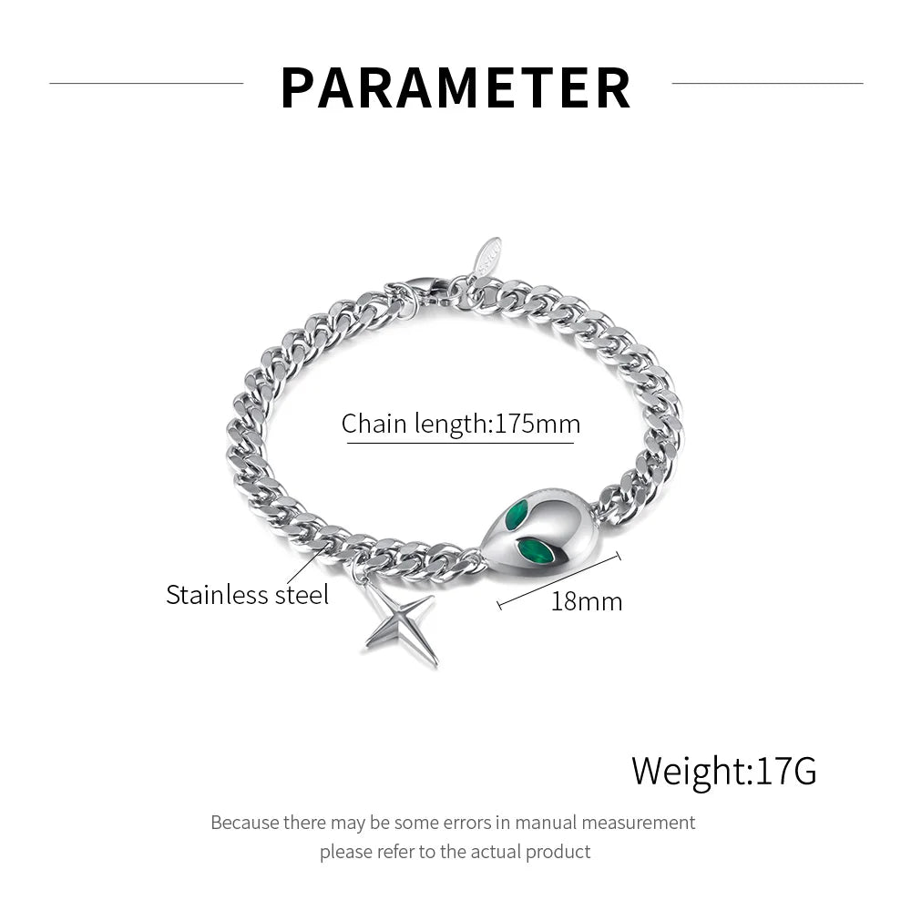 Unleash your rebellious side with our Fashion Alien Cuban Chain Bracelet. Crafted from premium stainless steel, this bold accessory defies conventional style with its otherworldly design. The durable Cuban chain pattern ensures this statement piece stays fierce through daily wear while turning heads everywhere you go. Dare to be different.