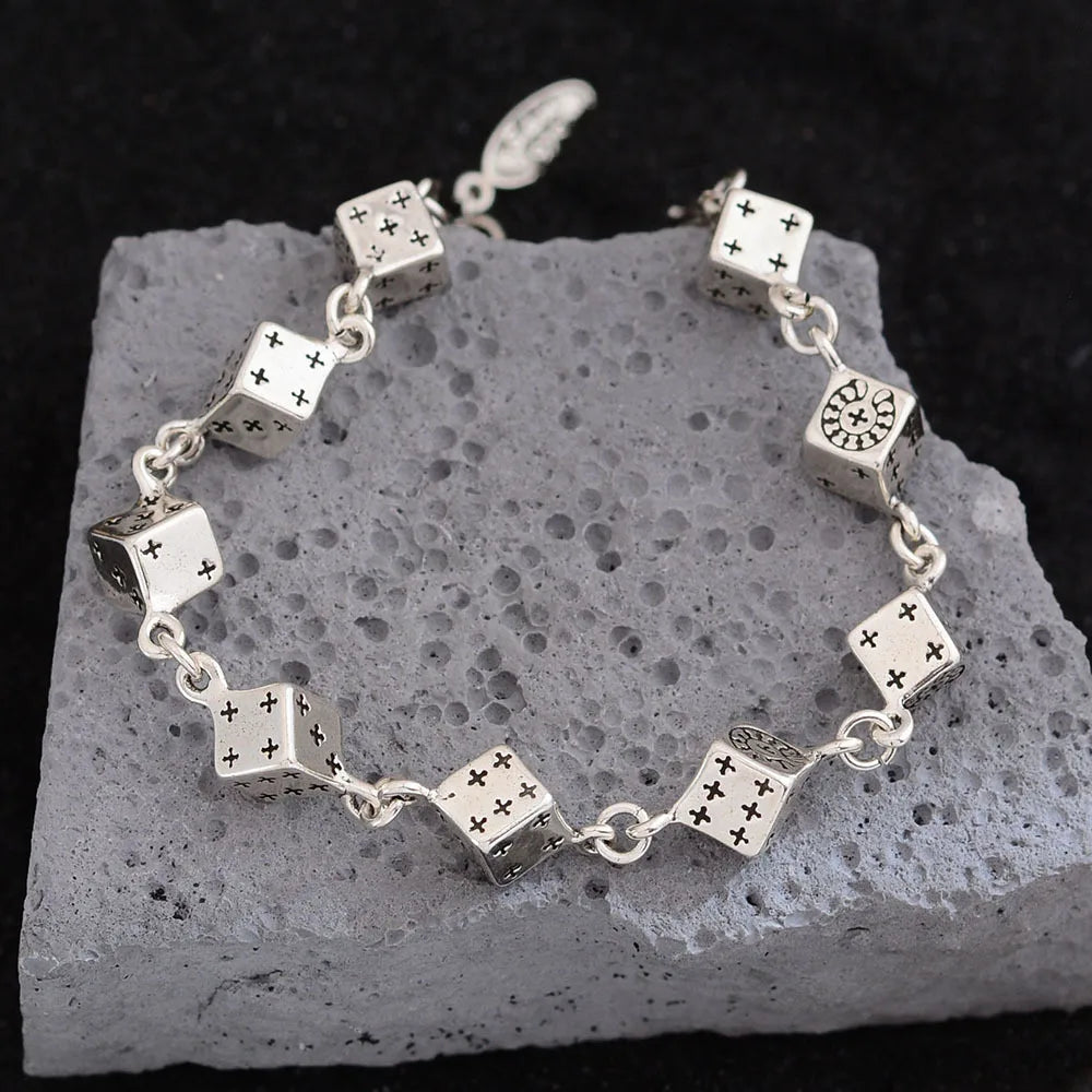 Crafted from lustrous 925 sterling silver, this Numeral Dice Cube Bracelet blends edgy geometric design with bold sophistication. Each cube-shaped link adds a striking, modern flair, making it a fearless statement piece that commands attention. Perfect for those who dare to showcase their unique style with a touch of refined elegance.