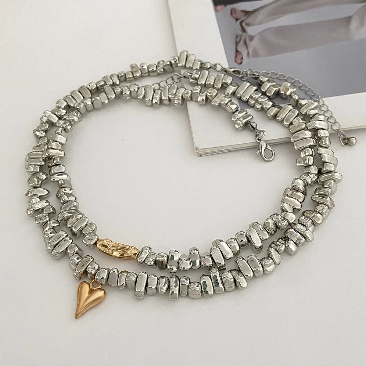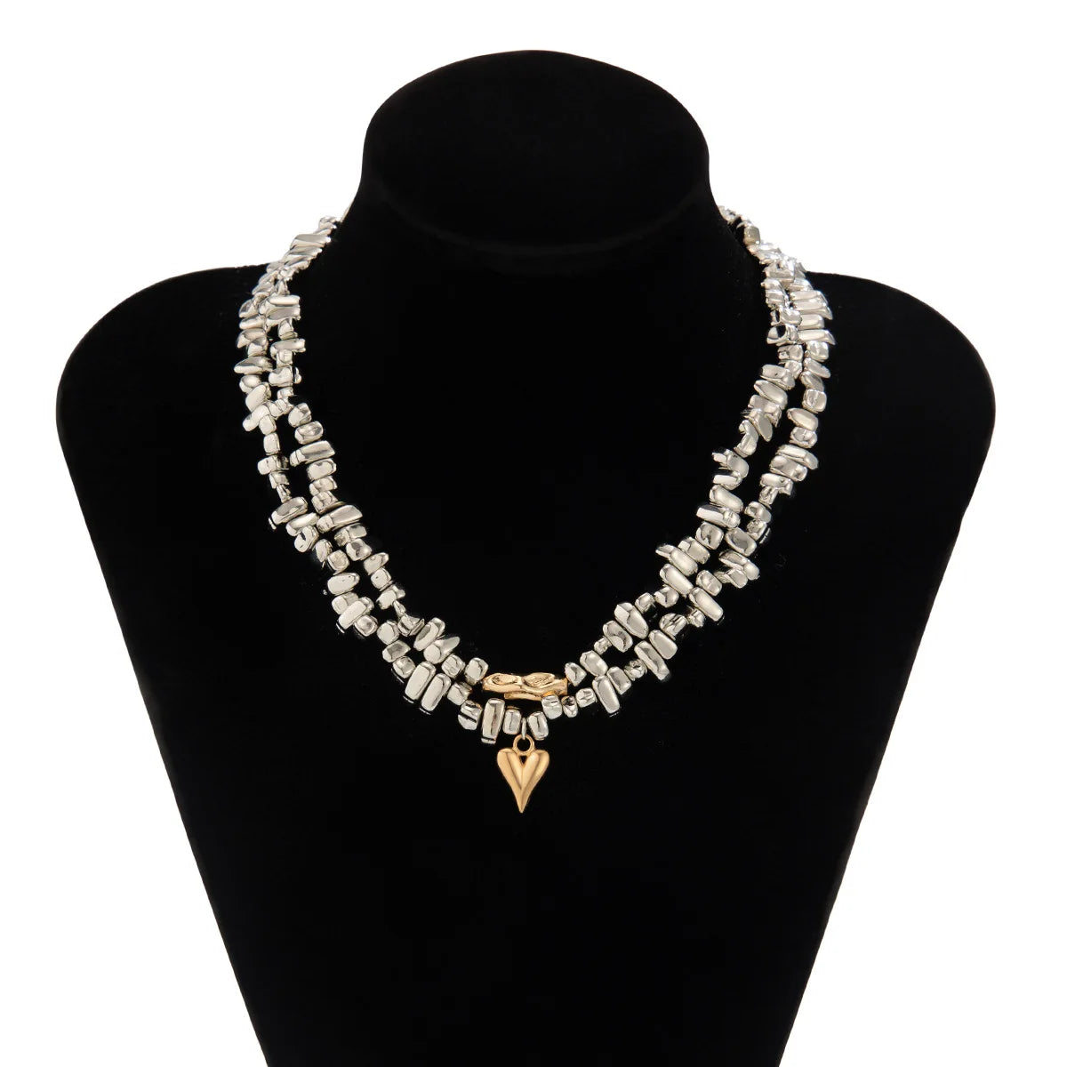Embrace bold vintage vibes with the Retro Silver Irregular Beads Multi-layer Necklace. Crafted from zinc alloy, its multi-layered design and unique bead shapes create a striking accessory that challenges convention while celebrating timeless style. Perfect for those who dare to stand out with a retro edge.
