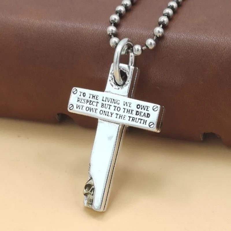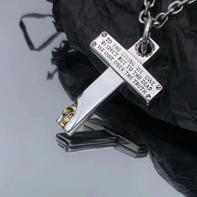 Half-Skull Cross with Letter Pendant Embrace your bold side with this striking pendant crafted from S925 sterling silver. Featuring an edgy half-skull design merged with a classic cross motif, this piece makes a fearless statement. The durable sterling silver construction ensures lasting quality while maintaining its lustrous finish. Perfect for those who dare to stand out and wear their attitude with pride.