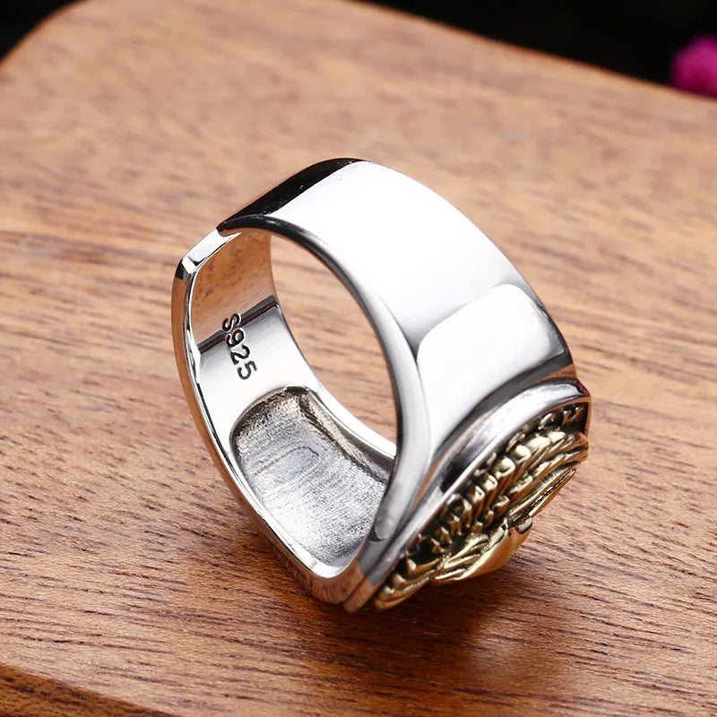 Soar above the ordinary with this striking Contrast Colored Flying Eagle Ring. Bold geometric lines capture the majestic power of an eagle in flight, while contrasting colors create dynamic visual impact on your hand. Perfect for those who refuse to blend in and wear their confidence like armor. Let your spirit take flight.