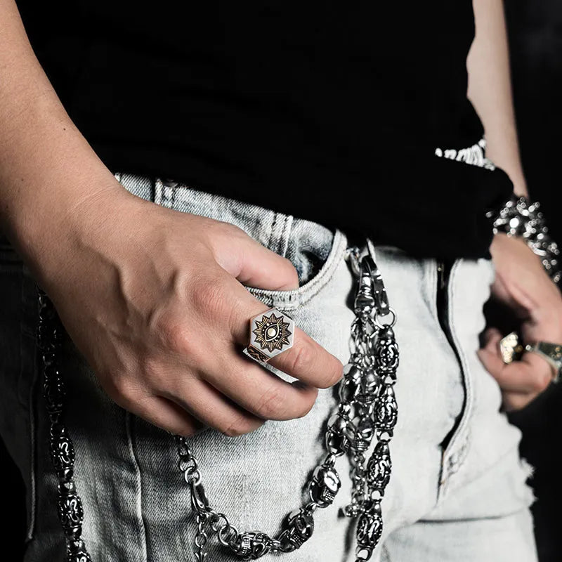 Crafted from 925 sterling silver, the Devil Eyes Hexagon Masonic Ring weighs just 10 grams, offering a bold yet comfortable statement piece. Its striking hexagonal design and daring devil eyes motif make it perfect for those who want to showcase their fearless style with a touch of mystery.