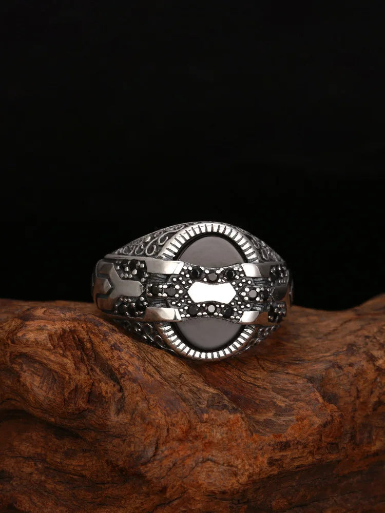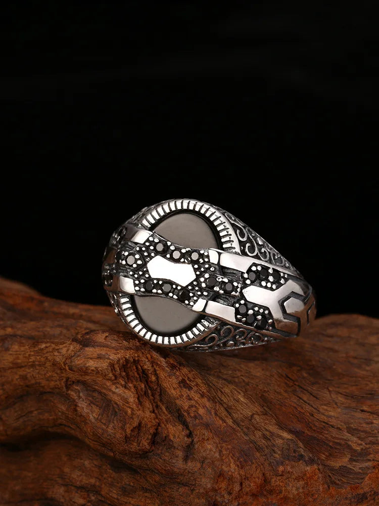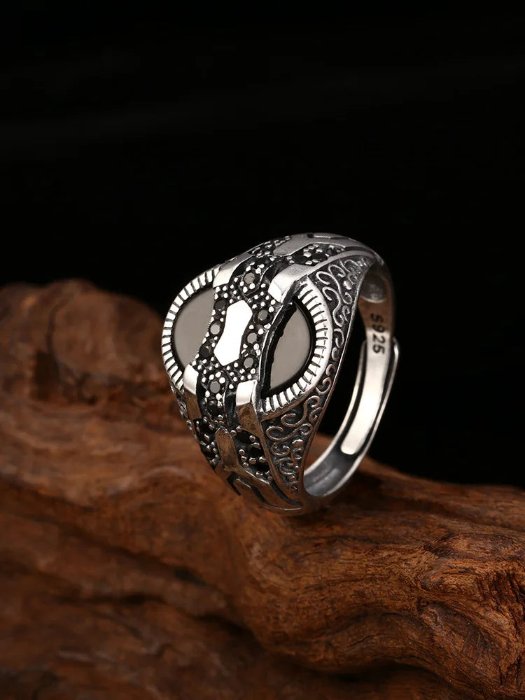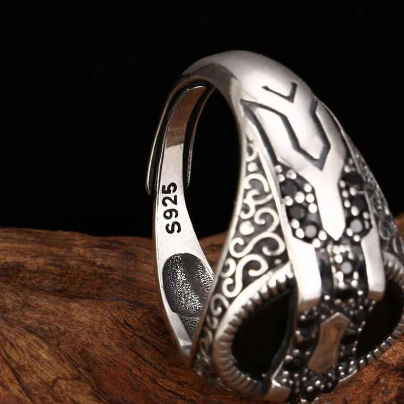 The Prismica Geometrical Rings, made of 925 sterling silver, feature a 16mm width and a zircon centerpiece. Adjustable from US size 6.5 to 10.5, they offer a precise fit with modern geometric design.