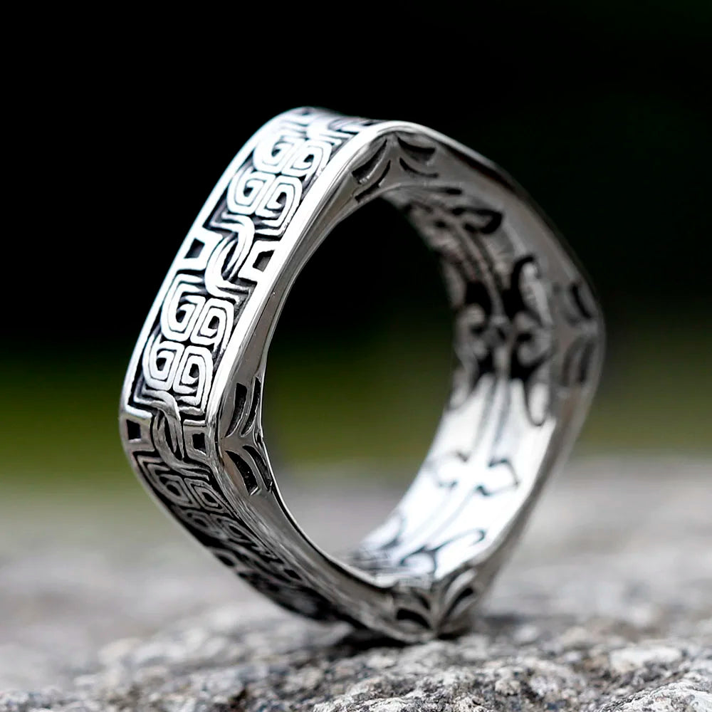Embrace bold elegance with the Rune Square Nordic Knot Ring. Crafted from durable stainless steel, its classic oval shape showcases intricate Nordic knotwork that commands attention. This ring is perfect for those who dare to wear timeless symbolism with a modern edge.