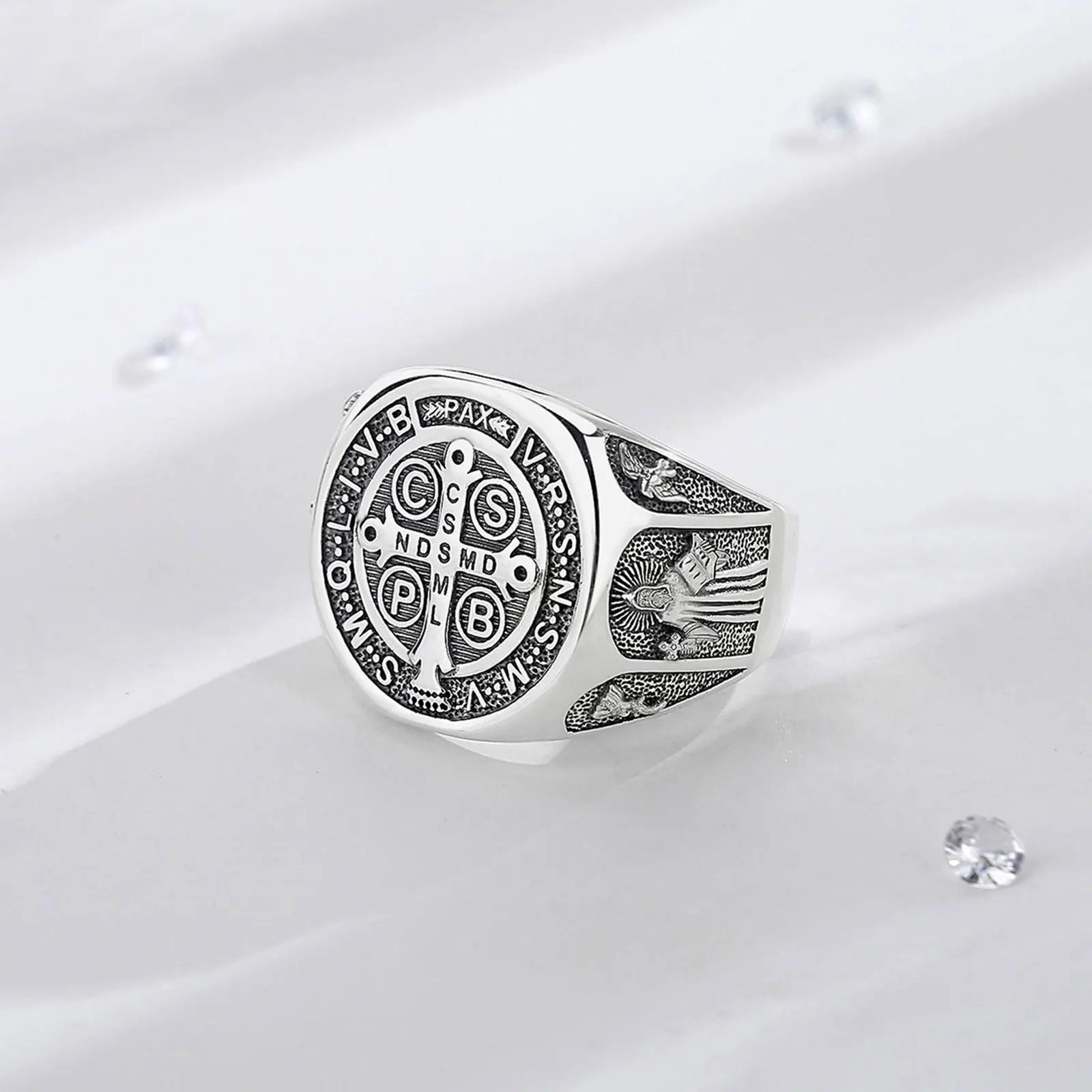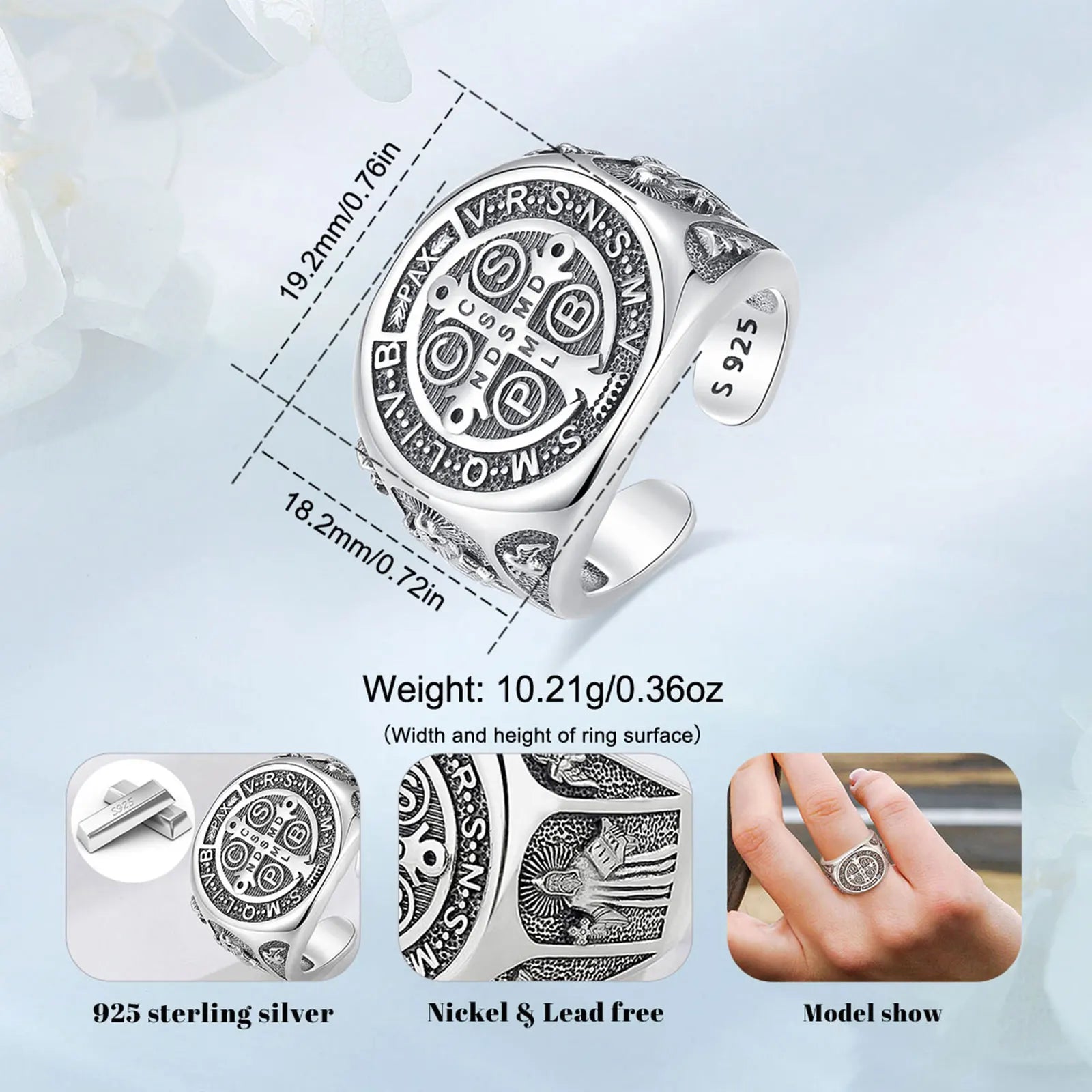 Crafted from genuine 925 sterling silver, this Saint Benedict adjustable ring boldly combines timeless spirituality with edgy style. Its adjustable design ensures a perfect fit, making it a striking statement piece that commands attention and channels powerful protection wherever you go. Elevate your look with this daring symbol of faith and strength.