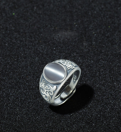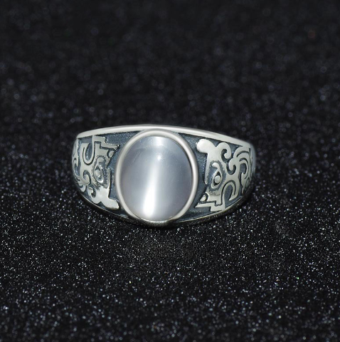 This natural moonstone ring has a striking look. The stone is set into the traditional setting of a silver band, and is enhanced with a beautiful natural stone which has a unique pattern of light and dark. The design makes it a timeless piece that is sure to stand out. A beautiful natural stone set into the traditional setting of a silver band.