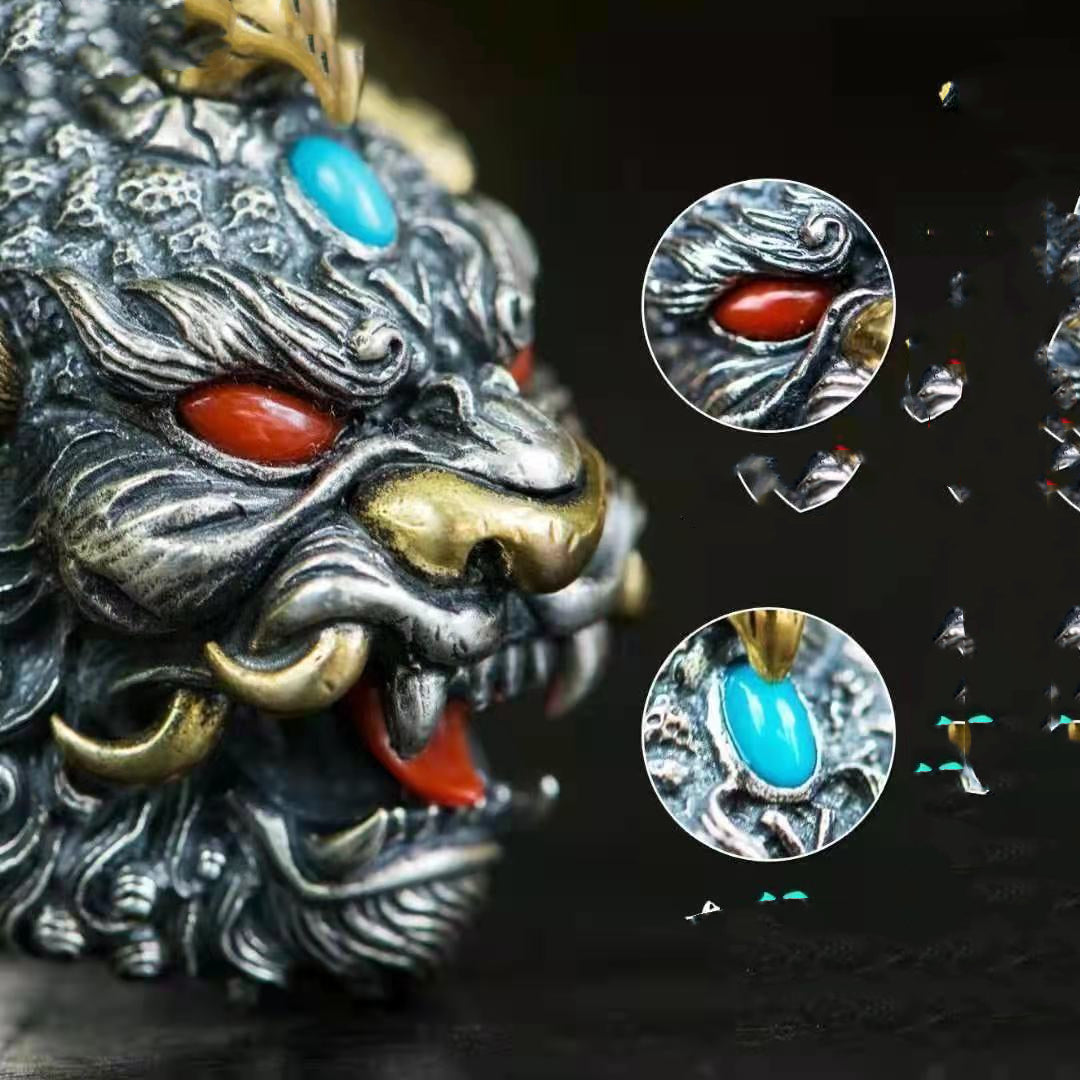 A traditional Chinese ring with an interesting design made of metal. This ring has an interesting design of Fu Dogs (an ancient Chinese mythical creature) surrounding the ring. The ring is made of metal with a simple clasp closure for safety reasons. The Fu Dogs symbolize luck, luck is what this ring is for. This ring is traditional but still trendy at the same time.