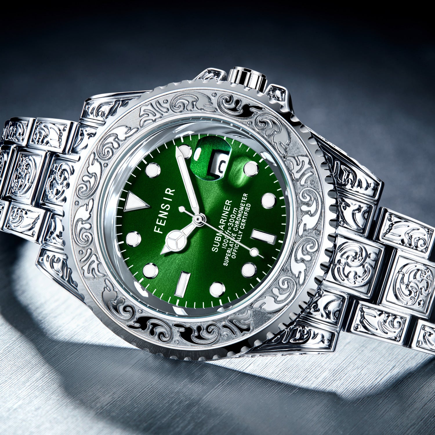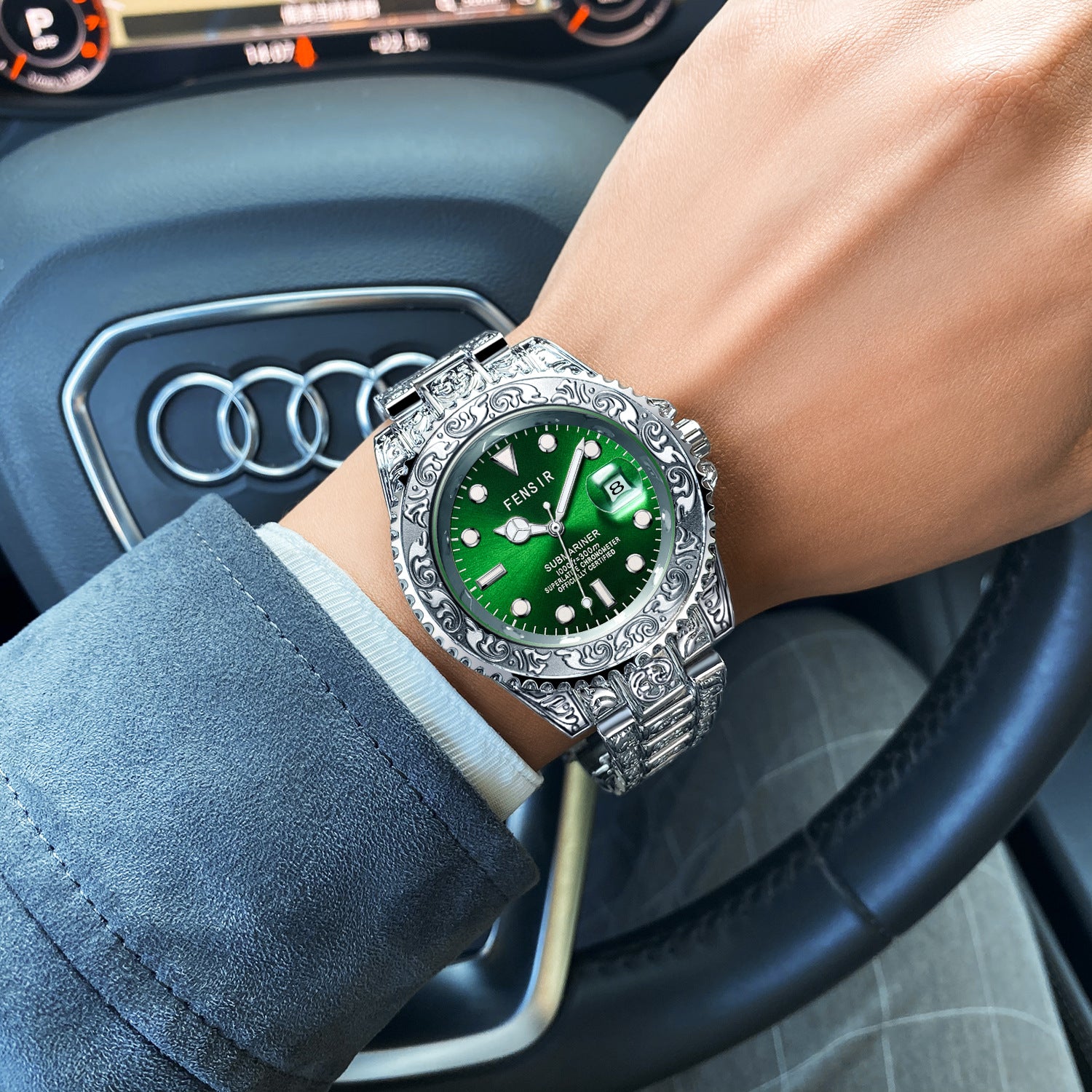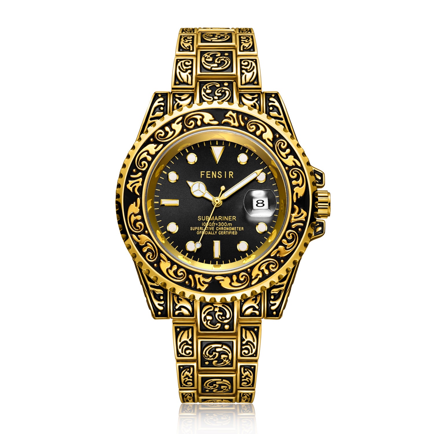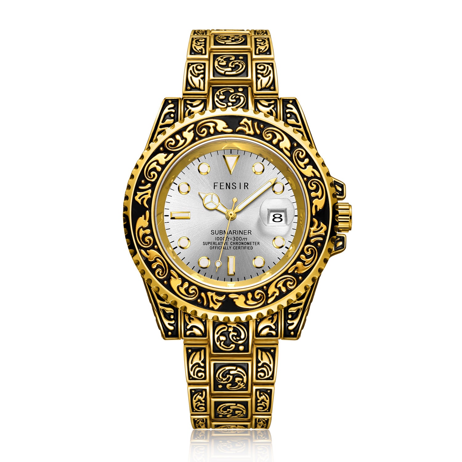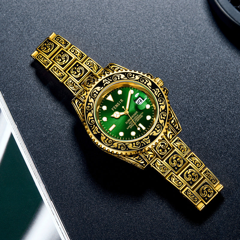 Enjoy a more rugged look with this men's watch. The sturdy stainless steel construction and bold color options make it a perfect accessory for any man. The ancient geometric graving pattern makes the design sleek and classic.