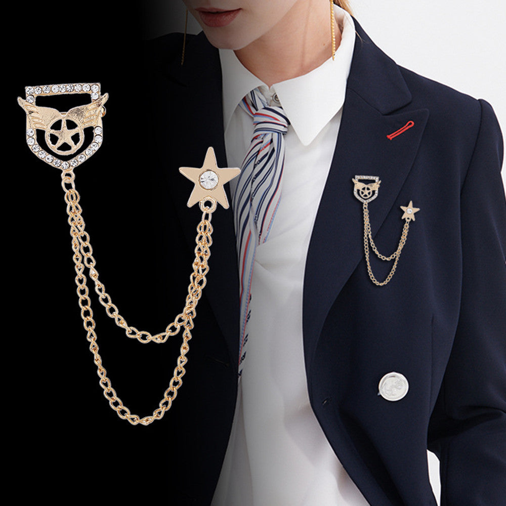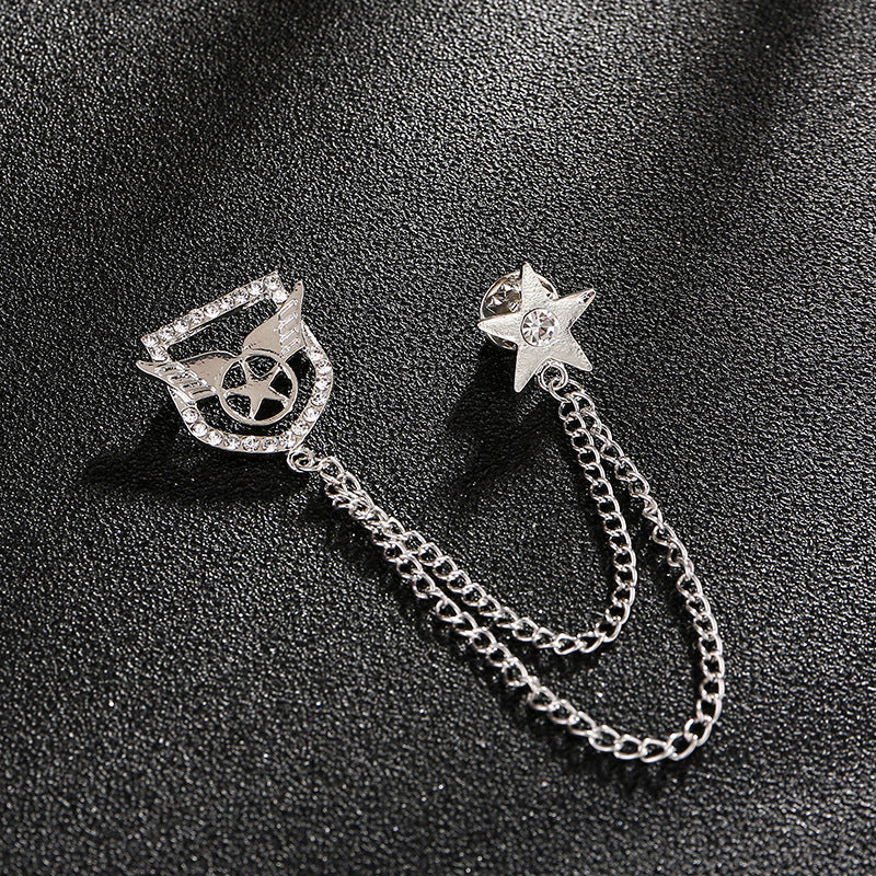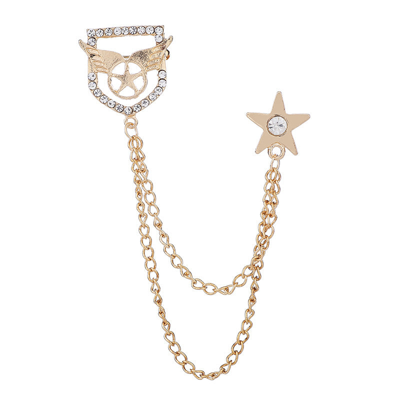 This gorgeous and stylish brooch features a delicate star with a diamond, and a stunning shield design. The two silver-tone pieces are connected by a gold-tone chain. This stunning piece would be a perfect gift for any occasion!