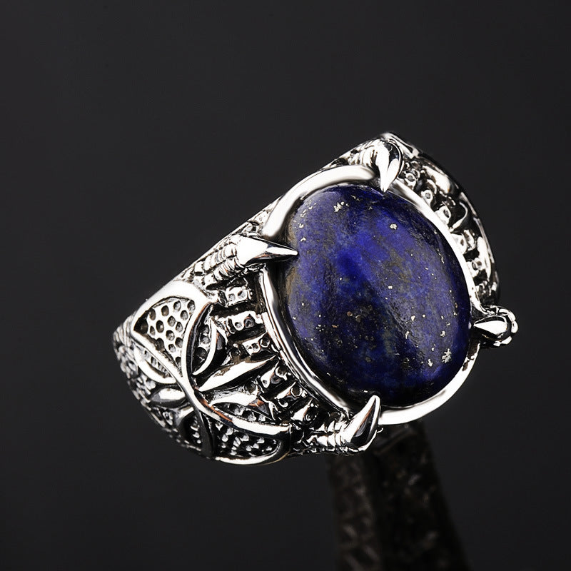 This men's ring is crafted from sterling silver and features a deep blue gemstone. It is available in a size 7-10. Perfect for a man who likes to add more style to his looks.