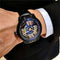 For the guy who loves to be different, this stylish men's watch is perfect for his wardrobe. It's a perfect gift for birthdays and holidays. The smooth, round design features a metal frame with an interesting geometric pattern. The leather straps have a simple, classic look.