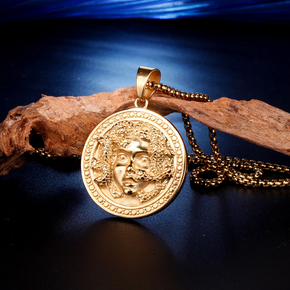 This is a men's necklace with a medusa design pendant and chain necklace. The chain and the pendant are made of titanium steel. The medusa design has a vintage look to it.