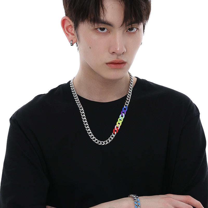 Give a new look with this men's necklace. The polished titanium steel is a sleek and stylish complement to any outfit. The Cuban chain style adds a fun and stylish touch to your look. The rainbow color is a colorful accent on this piece.