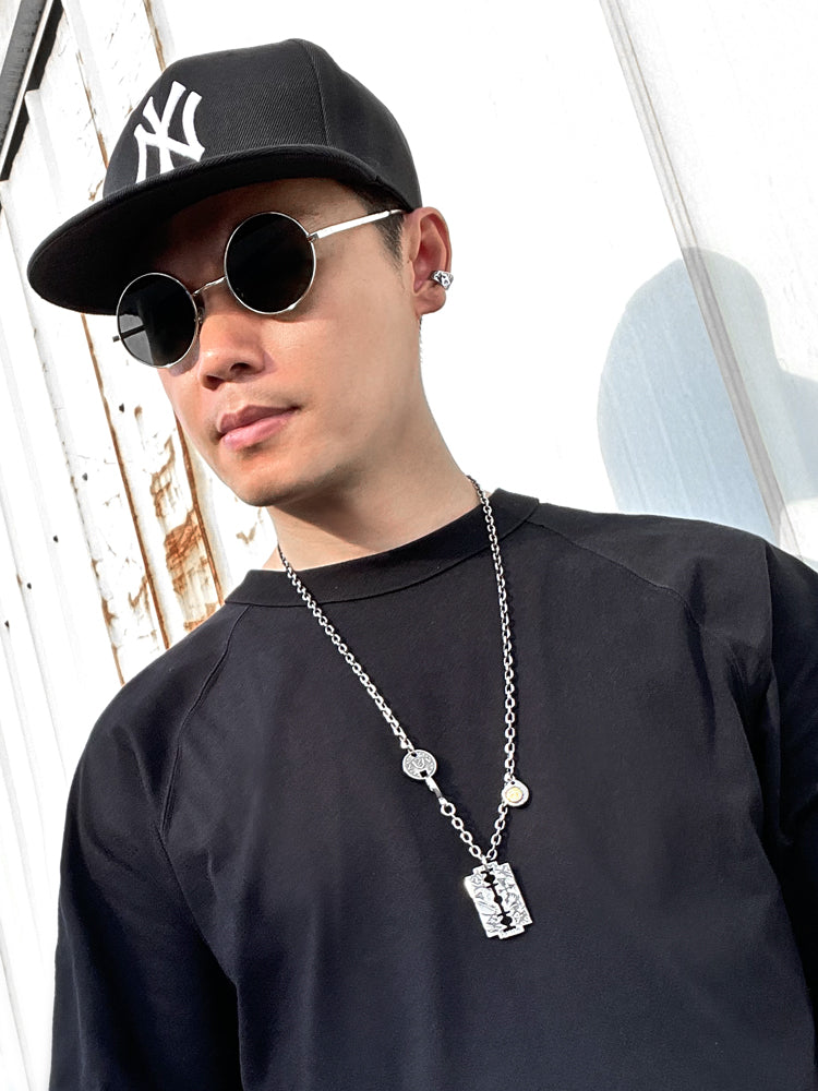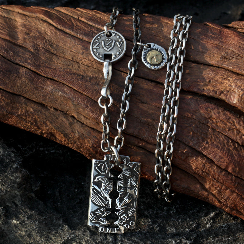 A stylish and unique razor blade pendant with a retro Japanese feel, this piece will add a touch of edge to your everyday look.