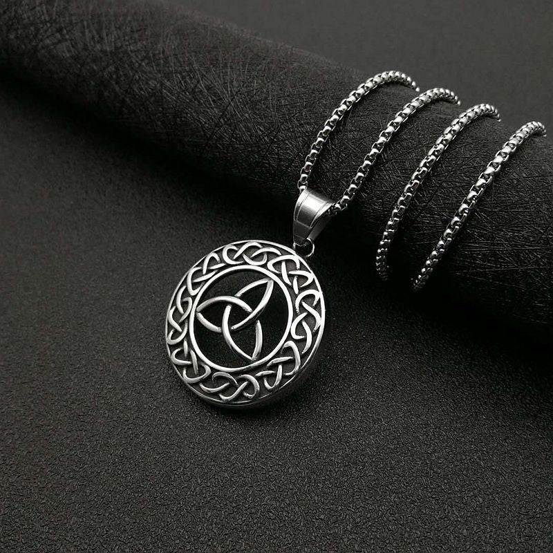 Trinity totem jewelry is made from a single piece of titanium. This type of titanium is heat treated to create a natural silver color. The unique design on the front of the piece allows the piece to be worn as a necklace or as a pendant.