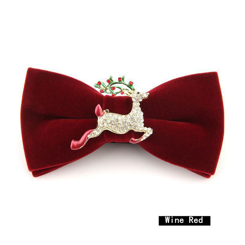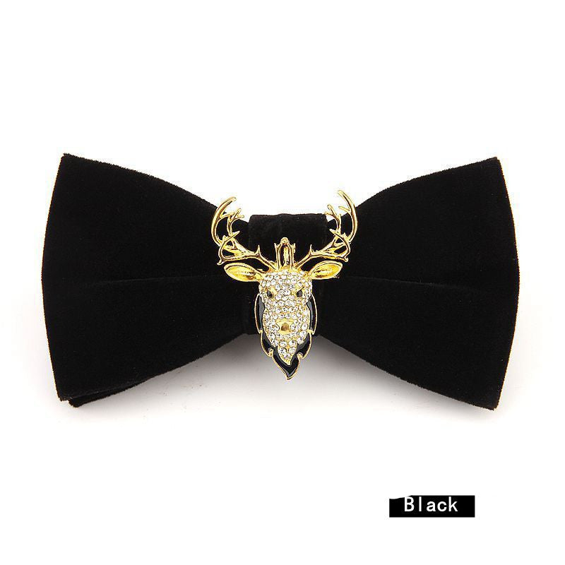 This is a Christmas tie with a deer design. The bow tie is made from a thick, soft velvet fabric that is the perfect material for a formal occasion and the rhinestone is in Christmas decorations. These classy and stylish men's bow ties are a fun and fashionable way to complete any outfit.