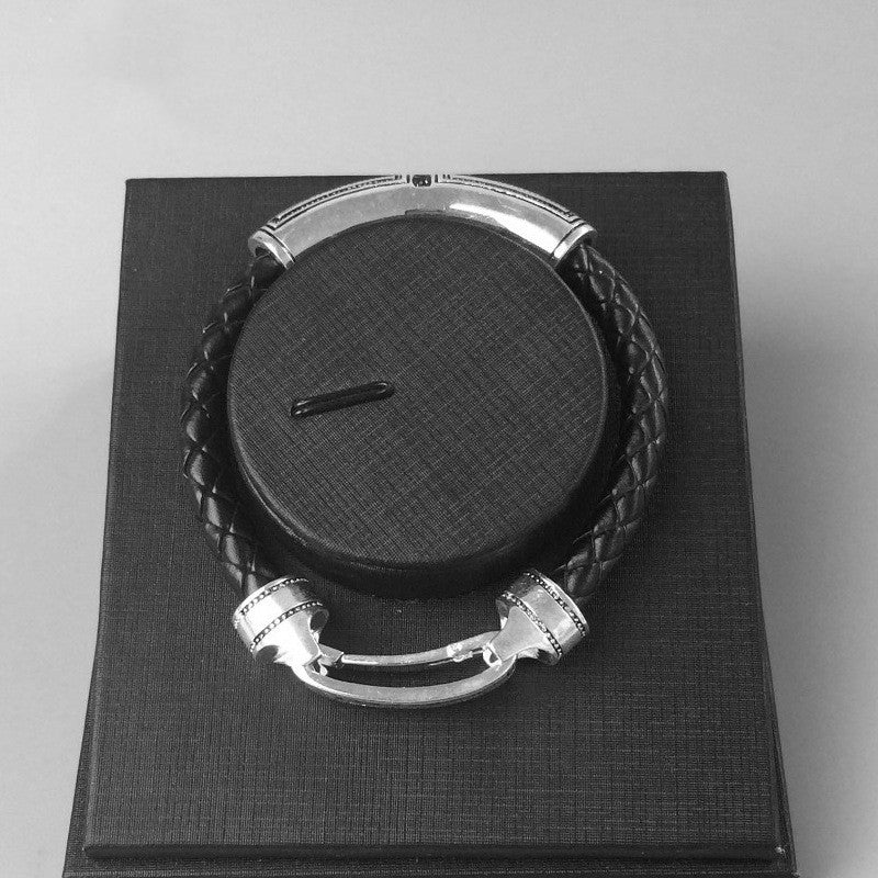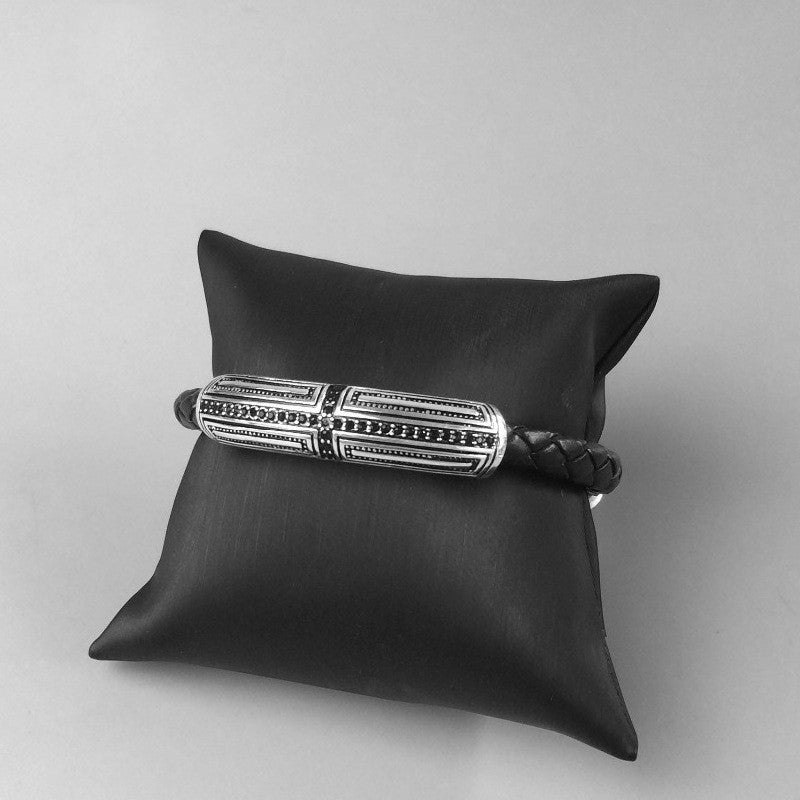 Woven Leather Bracelet Decorated with Geometric Roman Pattern Silver Pendant