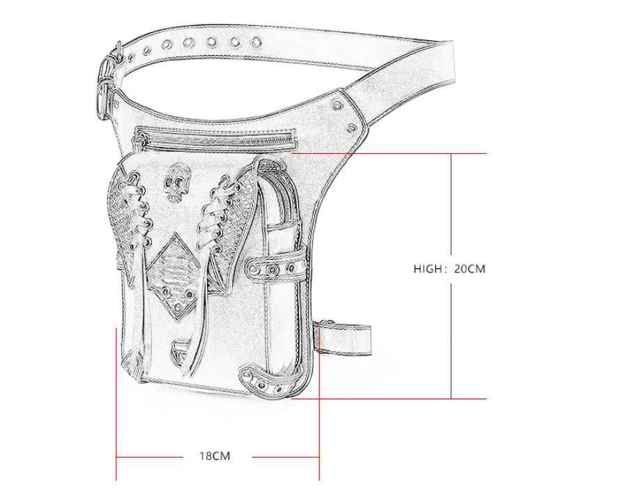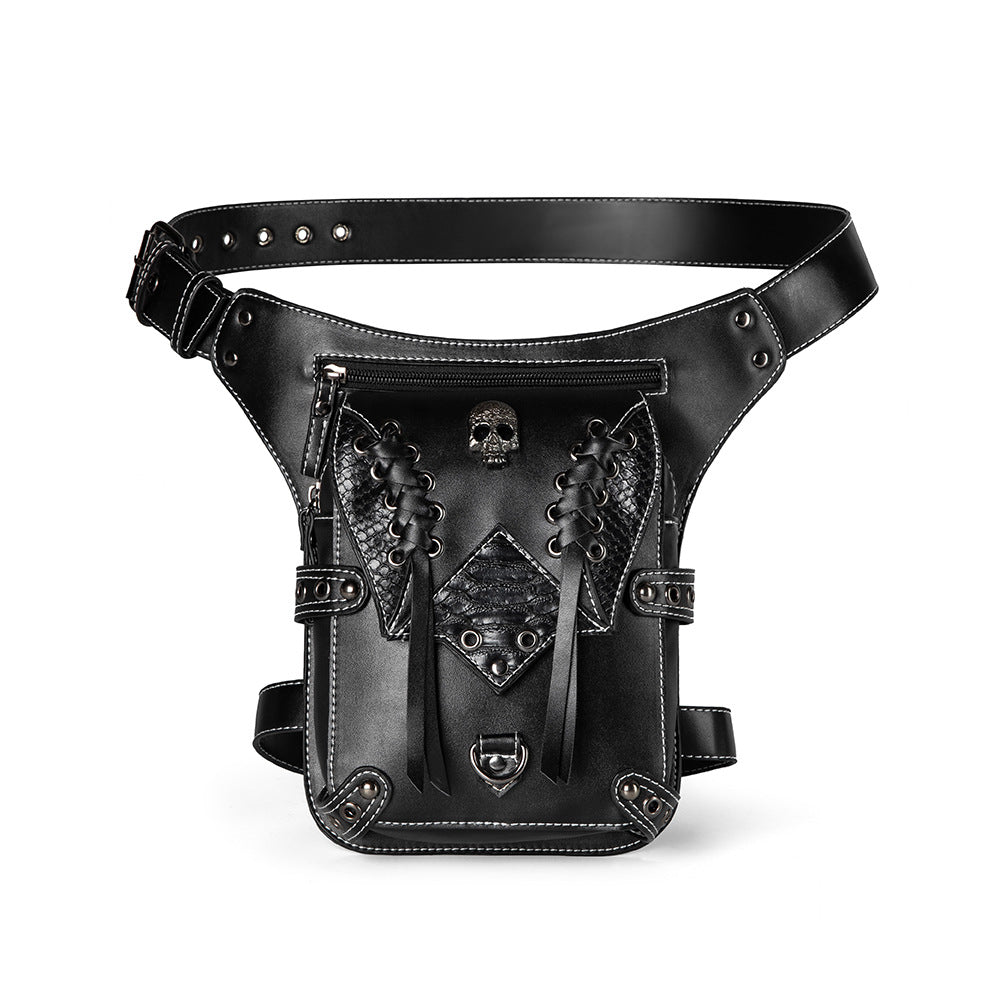 This cool metal waist bag will add a touch of mystery to any outfit. Designed with a metal skull applique, it's a great way to express your own unique style. The bag is made from PU leather material. It has a cross stitch decoration on the front of the bag and it contains a zipper.