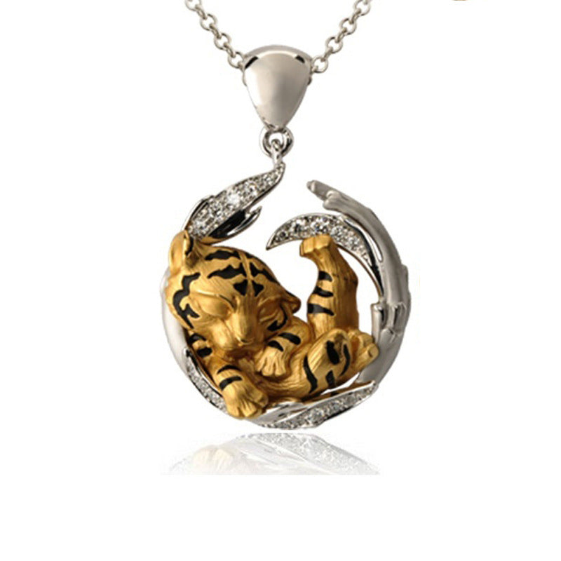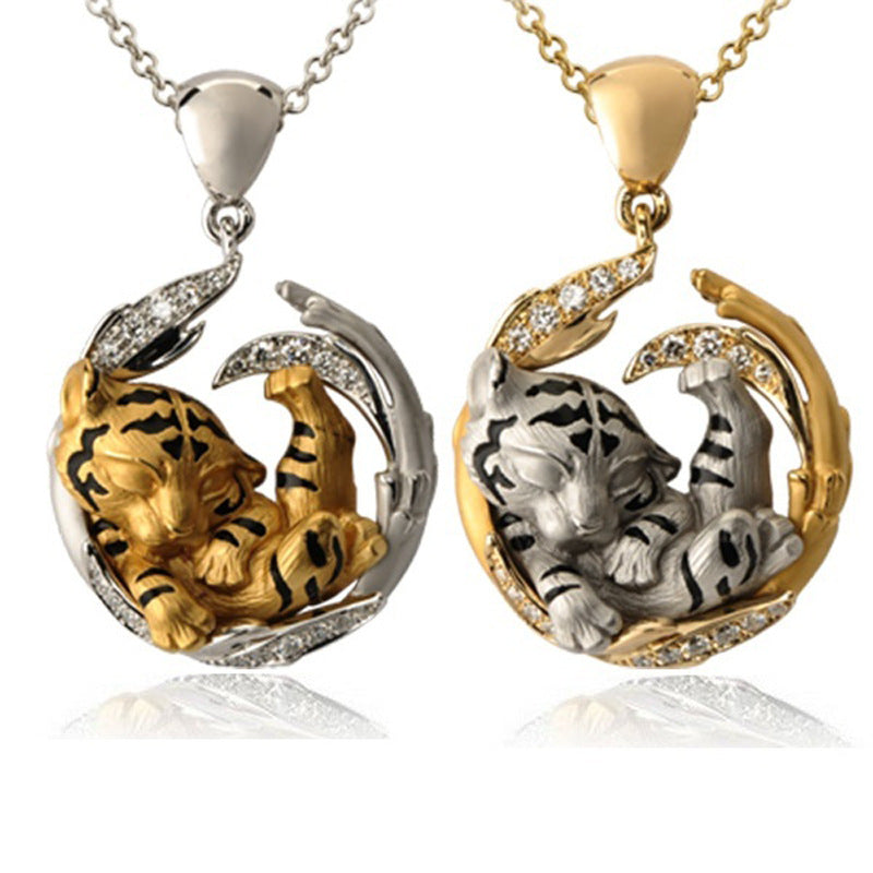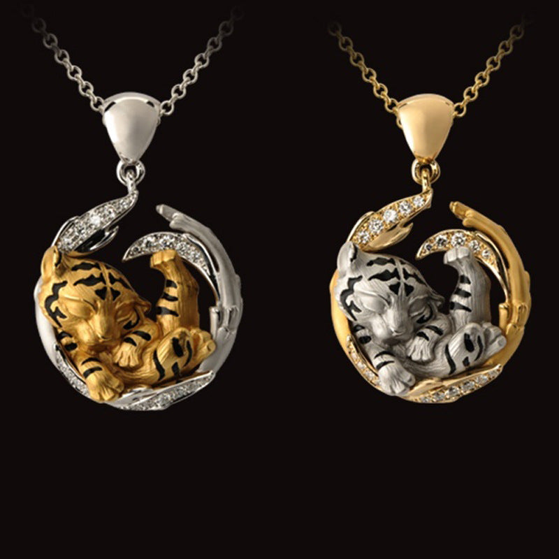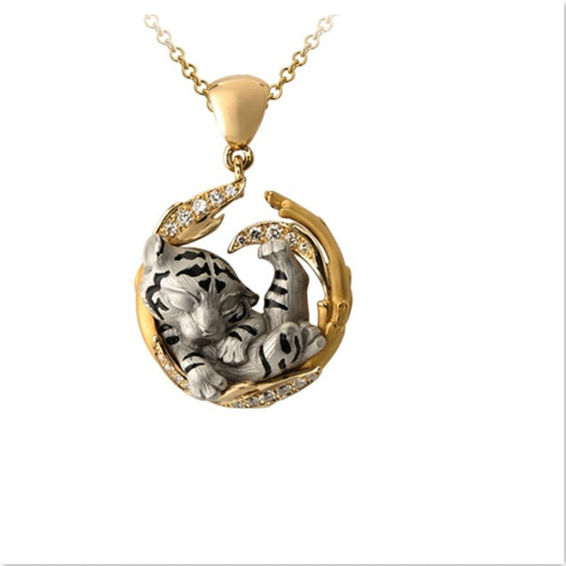 A unique and eye-catching necklace for any occasion. It is built with alloy material and also has a round shape. It has a sleeping baby tiger design in the center.