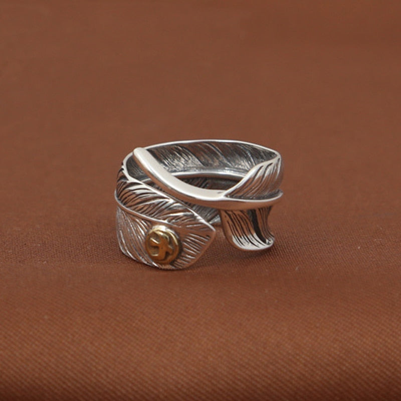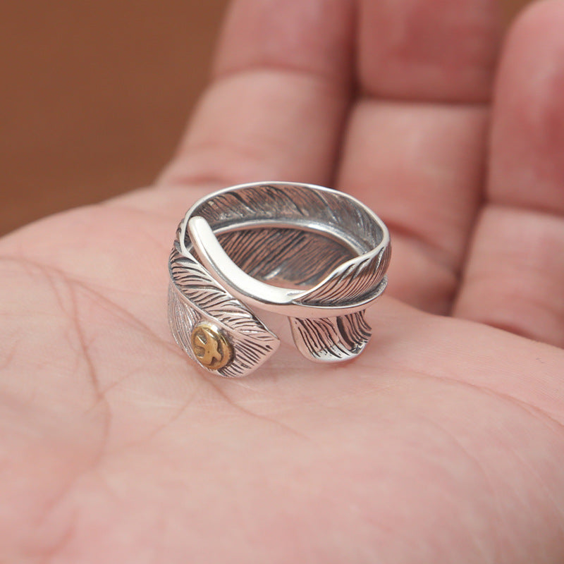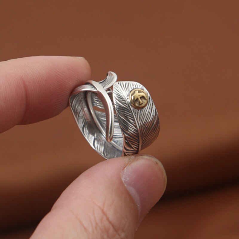 Adjustable 925 Sterling Silver Ring with Curving Feather Design and Flying Eagle Decoration